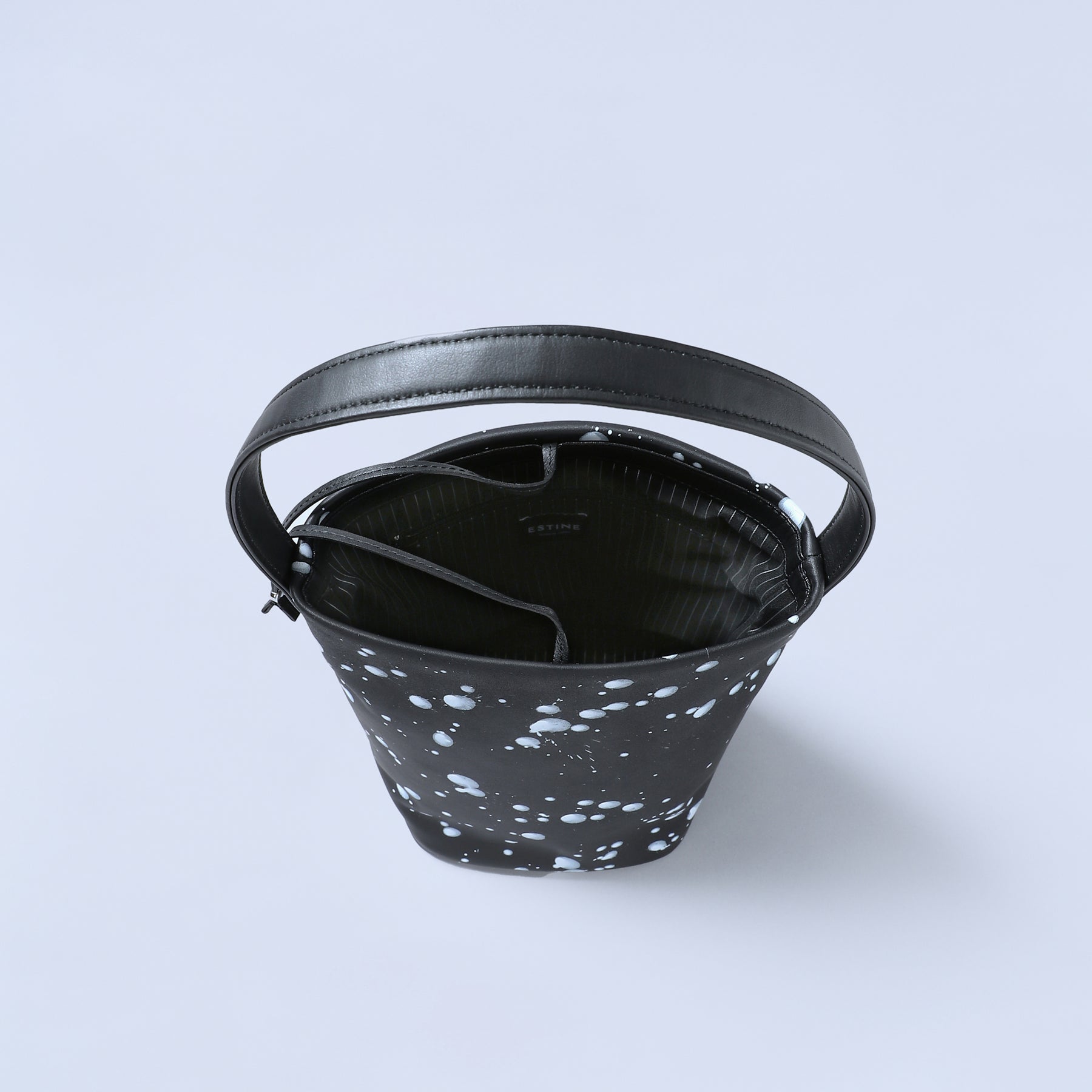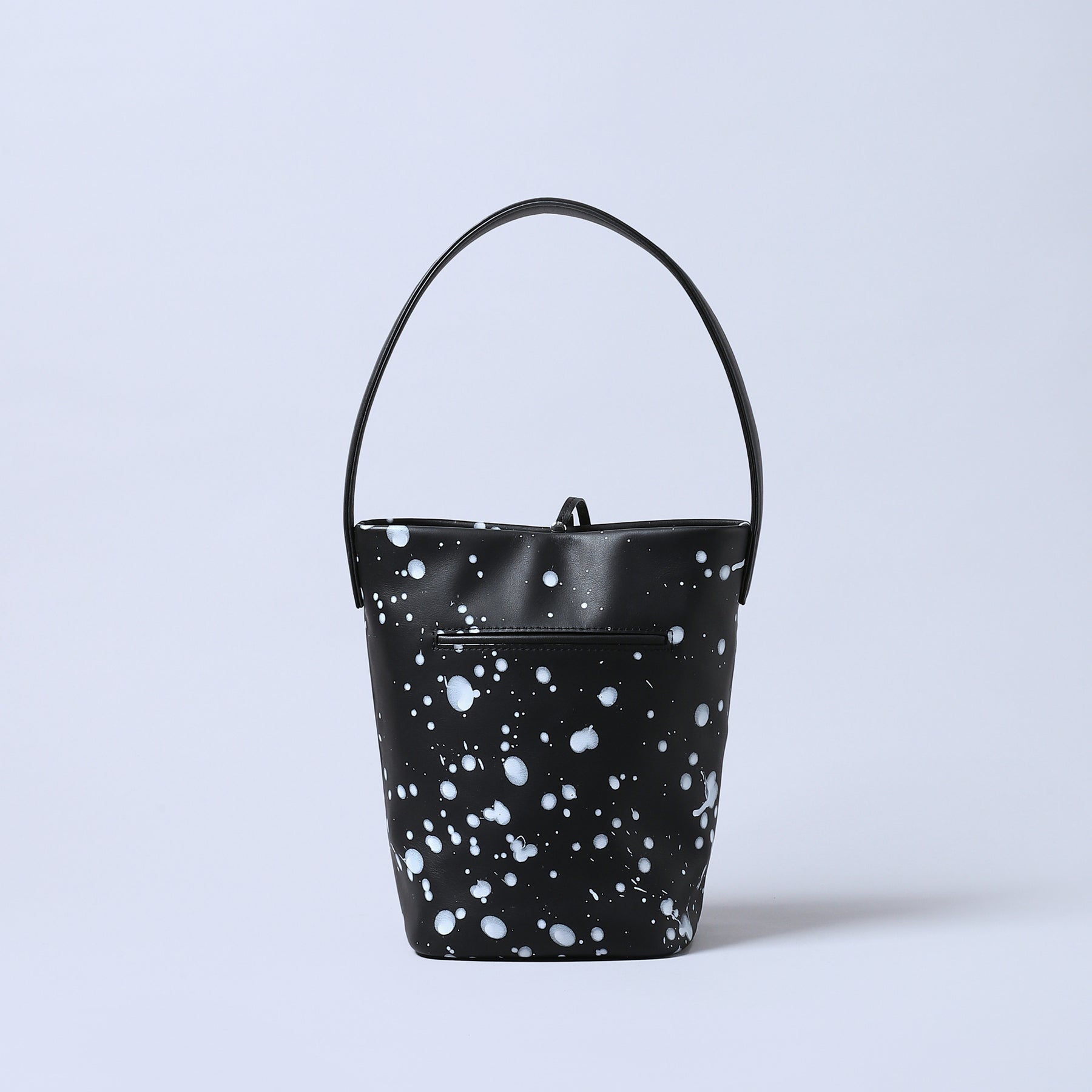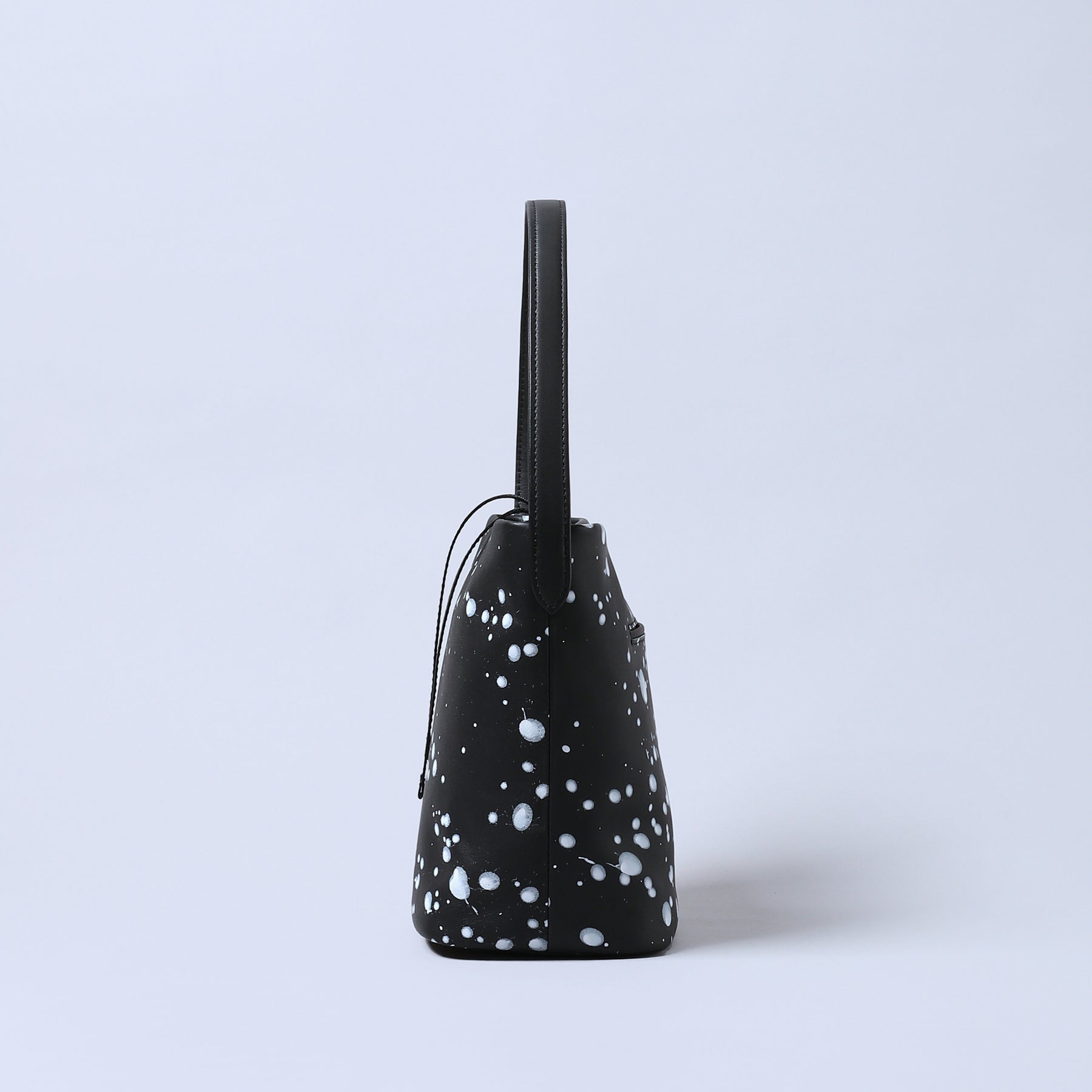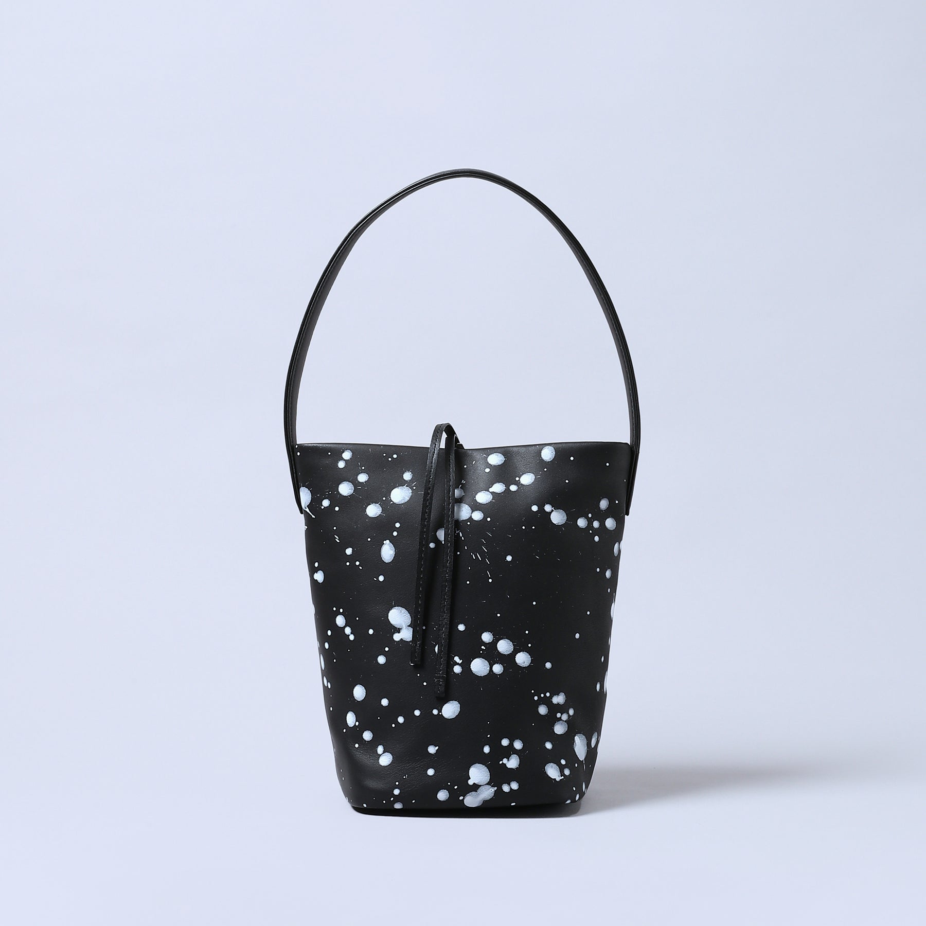 漆黒のスムースレザーに、ホワイトのスパッタリングペイント。偶然が描く抽象的な軌跡が他にないパターンを刻む。ペイントは使い込むほどにクラックし、素材と響きあい質感が深化。アートとモードが交差するエッジィな造形は視線を引き寄せ、スタイルに確信を与える。