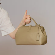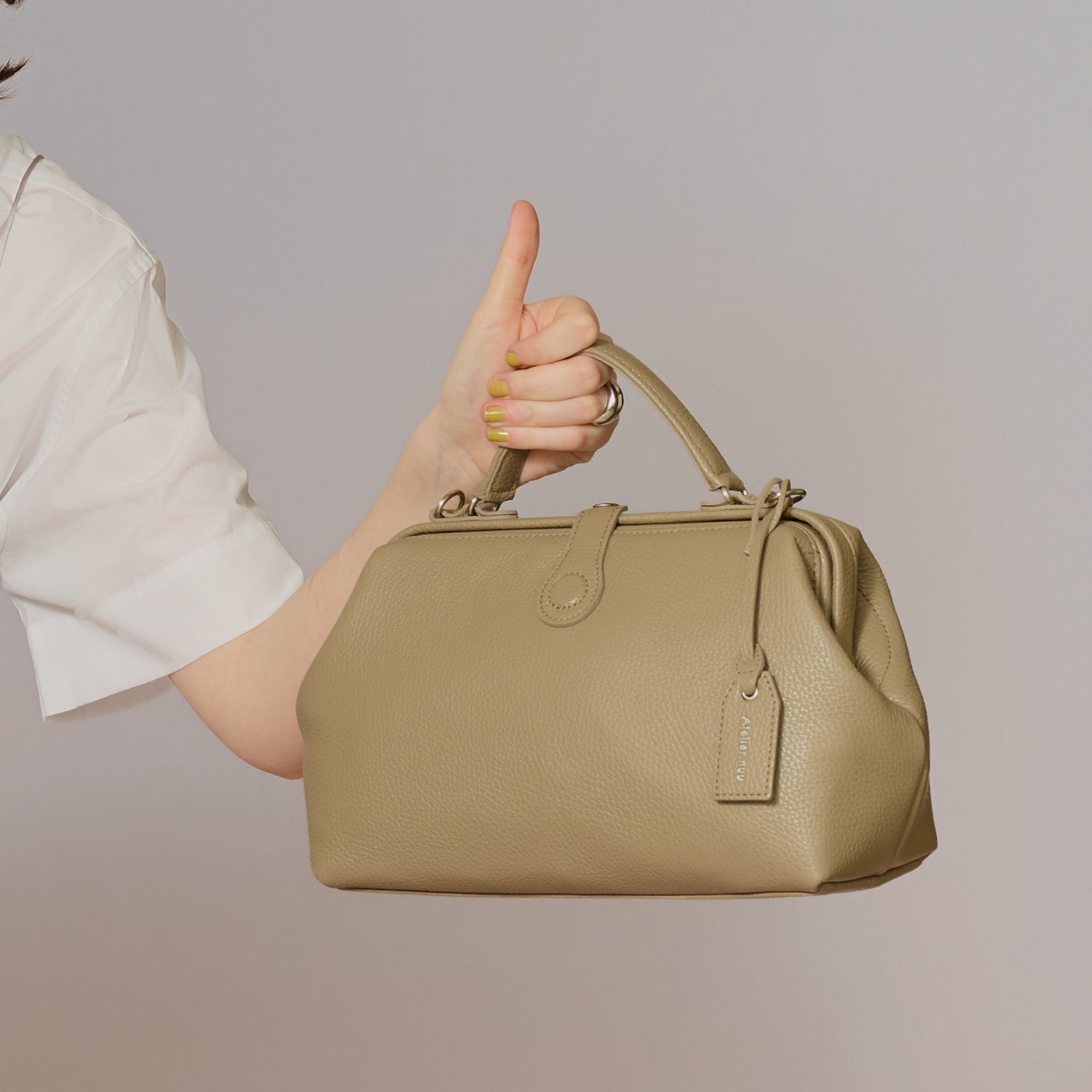 <Soft touch and gentle feeling of nuanced colors> The main body is made of Italian shrink leather with a soft touch that is almost addictive. It has an elegant graininess and is resistant to aging. This "Dulles bag" has an aluminum frame at the opening. The snap button can be removed with one hand, and the bag can be opened easily and hassle-free. The wide opening makes it easy to see inside and easy to put things in and out of the bag. It can be used not only as a handbag, but also as a shoulder bag by connecting the attached shoulder belt. Three nuanced colors are available, all of which make a perfect accent for any outfit.
