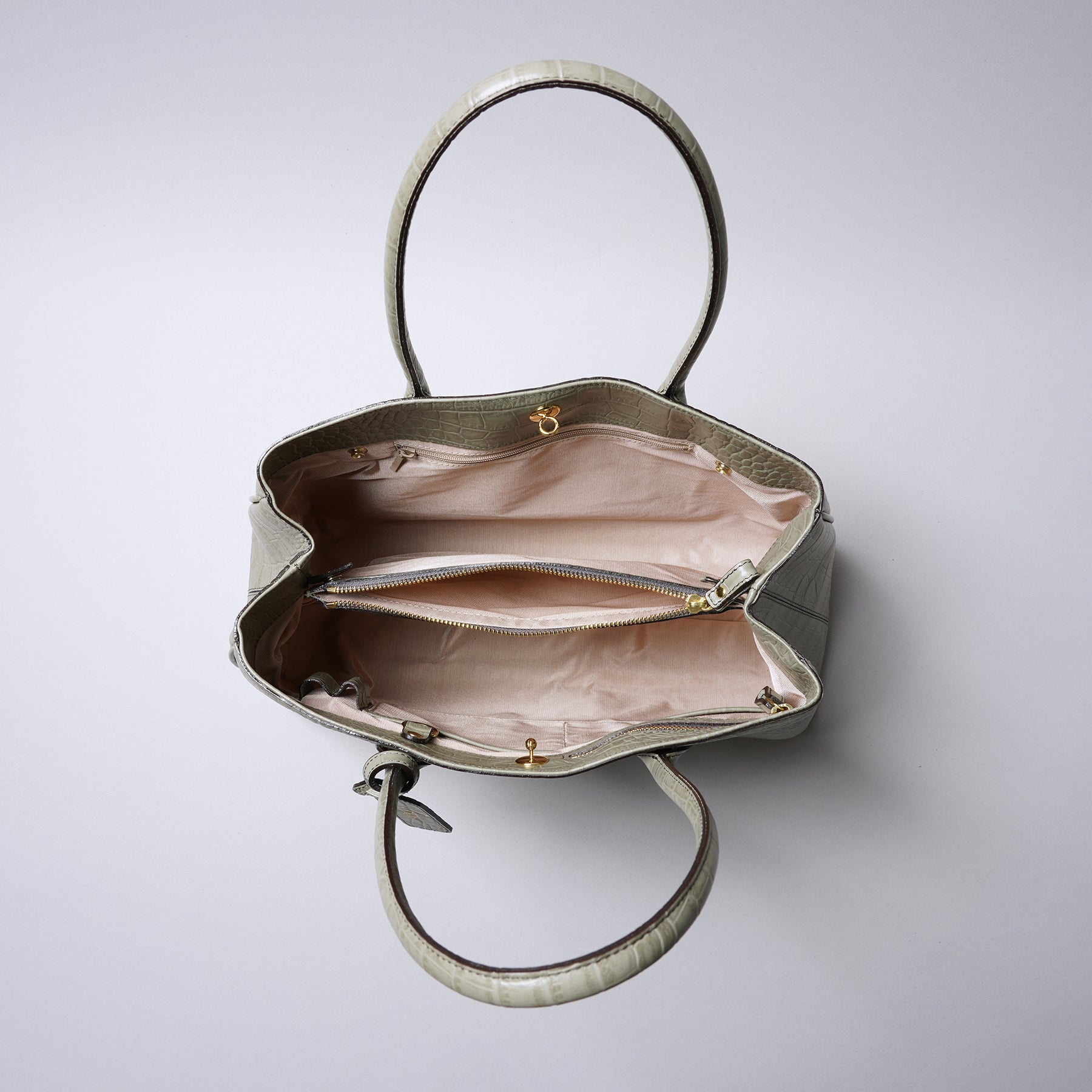 ビジネスシーンからデイリーシーンまで幅広く活躍するシリーズです。上品なクロコの型押し牛革を使い、中央の仕切り状についたポケットはホックで取り外しが可能で、背側に付け替えることも可能です。カード入れやペン差しなどのポケット類も充実しマザーバッグのような収納のしやすさを追求しています。