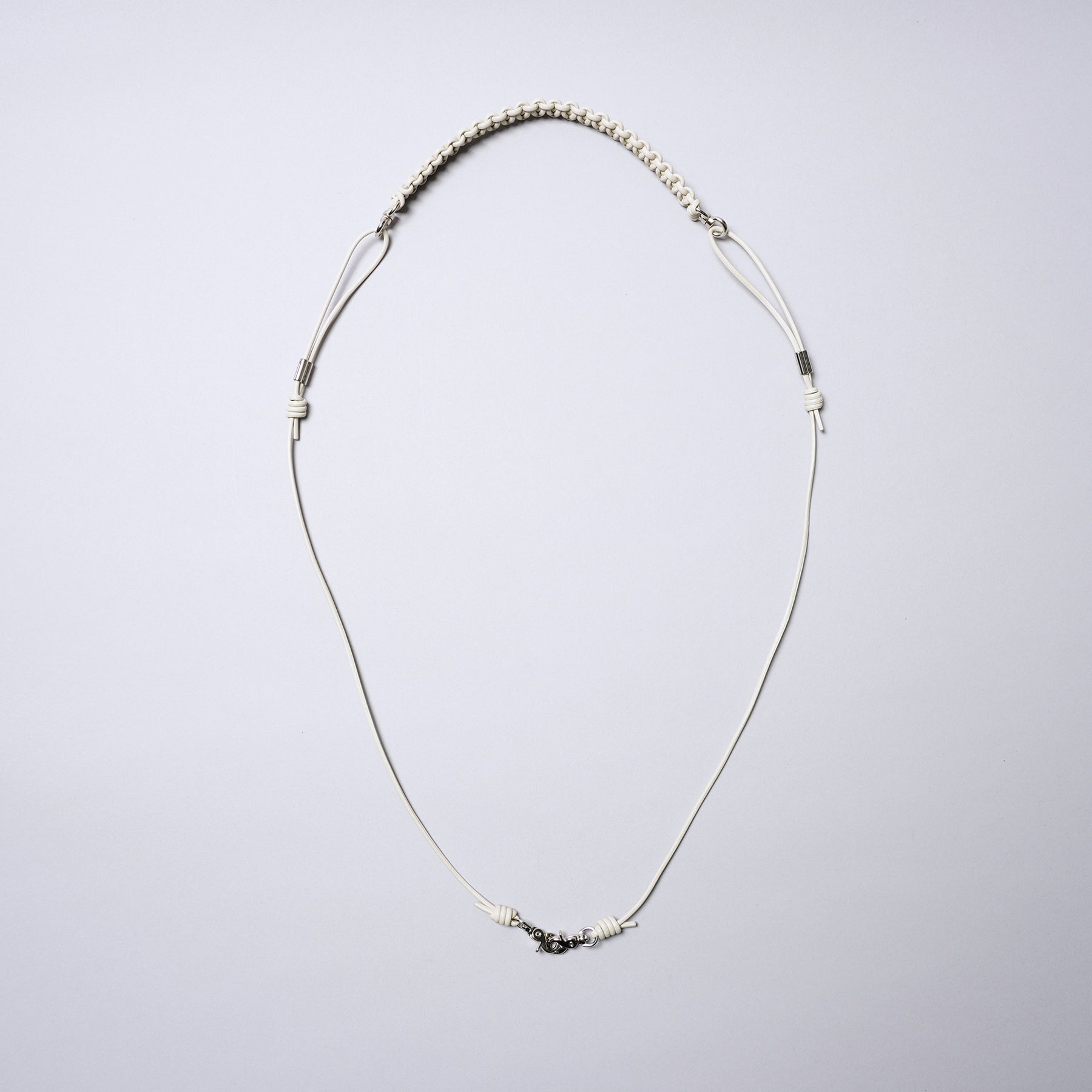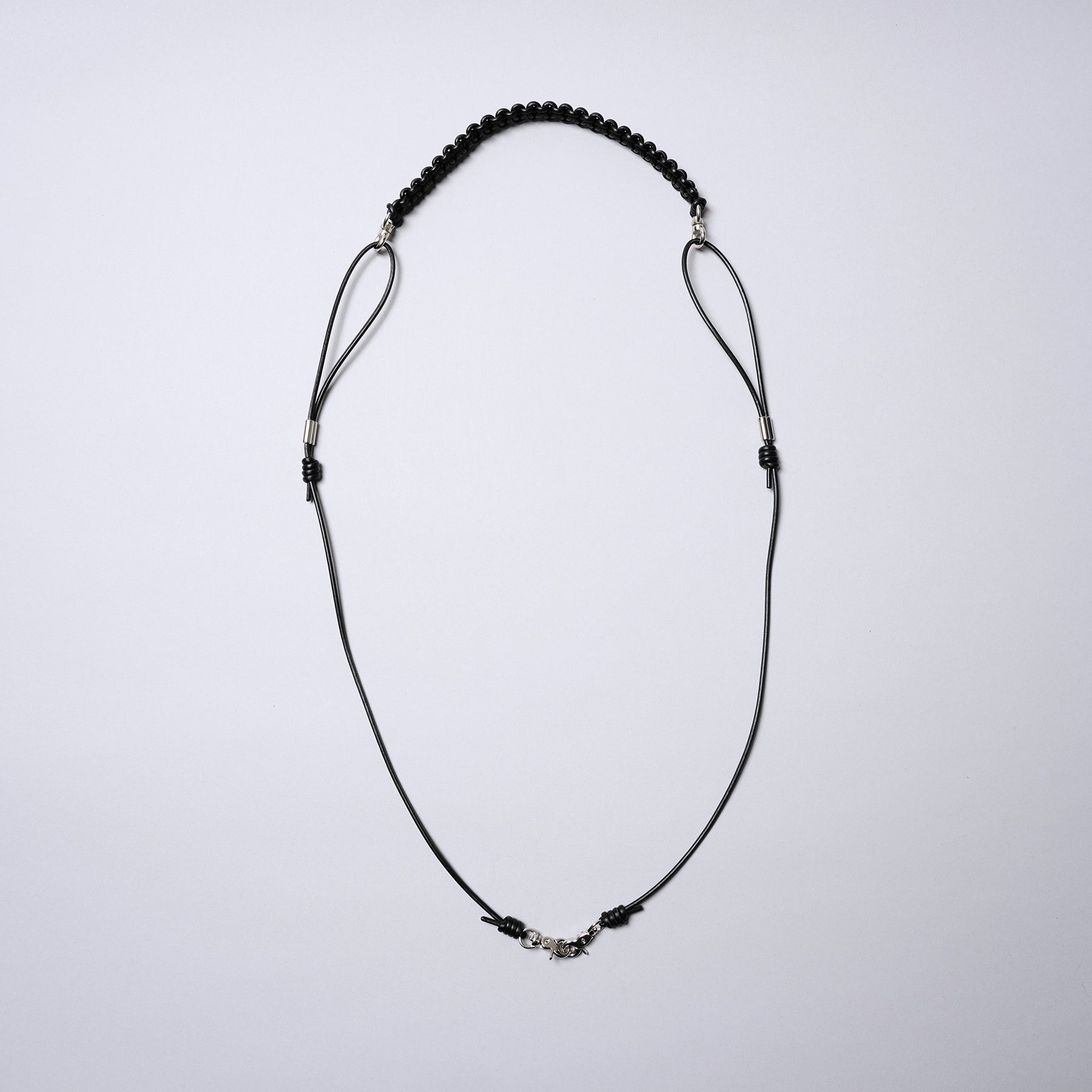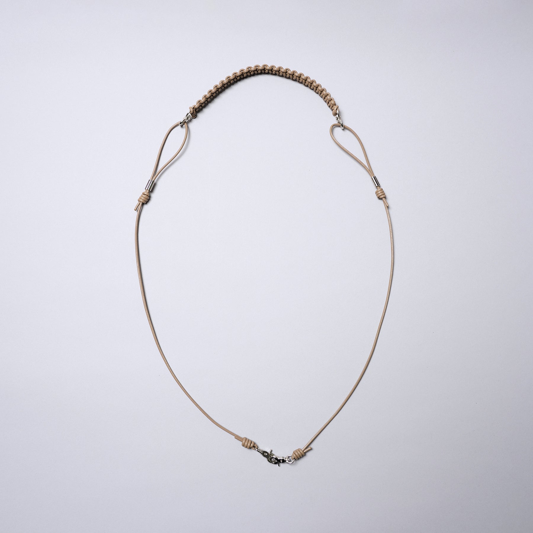 負荷がかからないよう肩位置にはレザーコードを編み込み、テープ状に仕立てたパーツをあしらったマルチストラップ