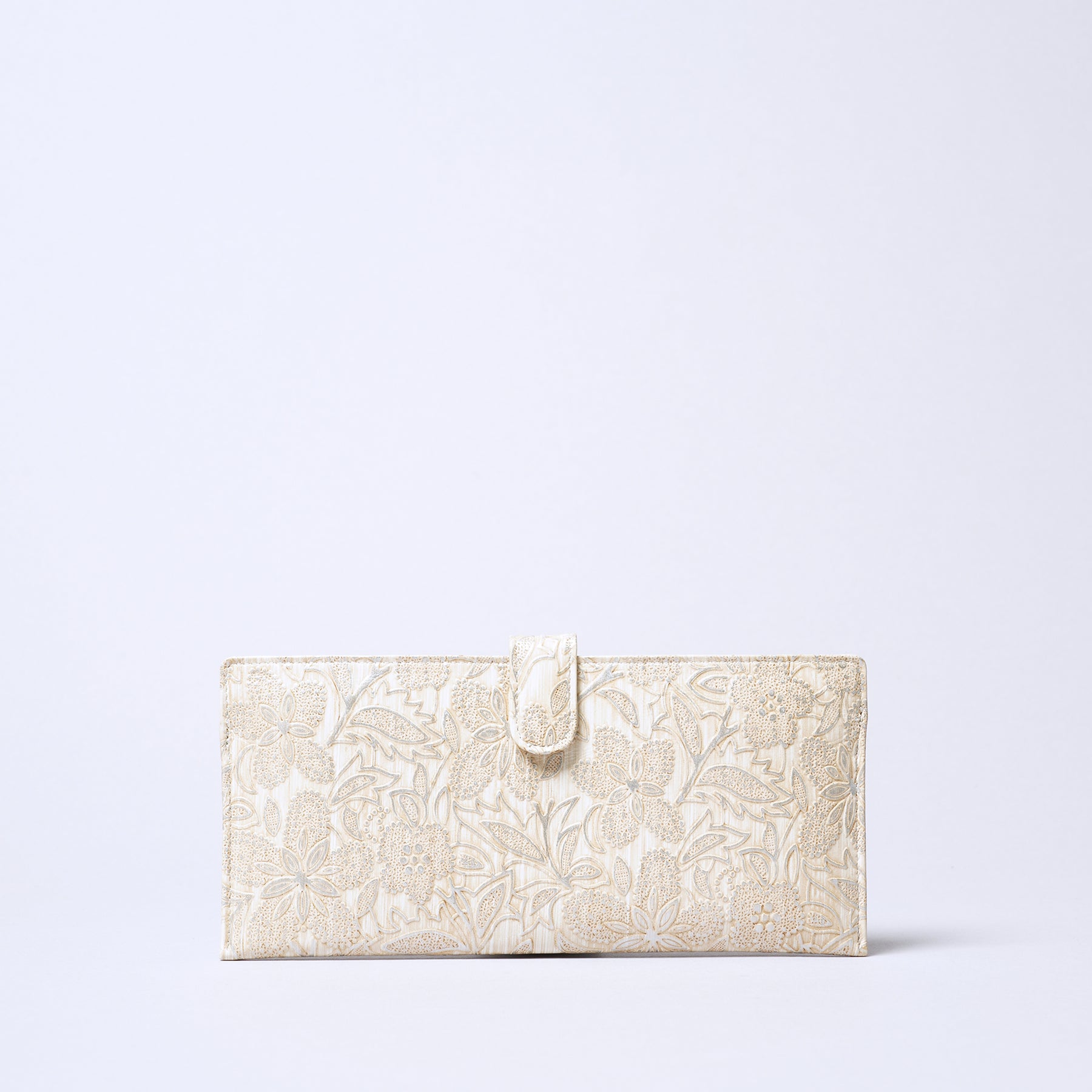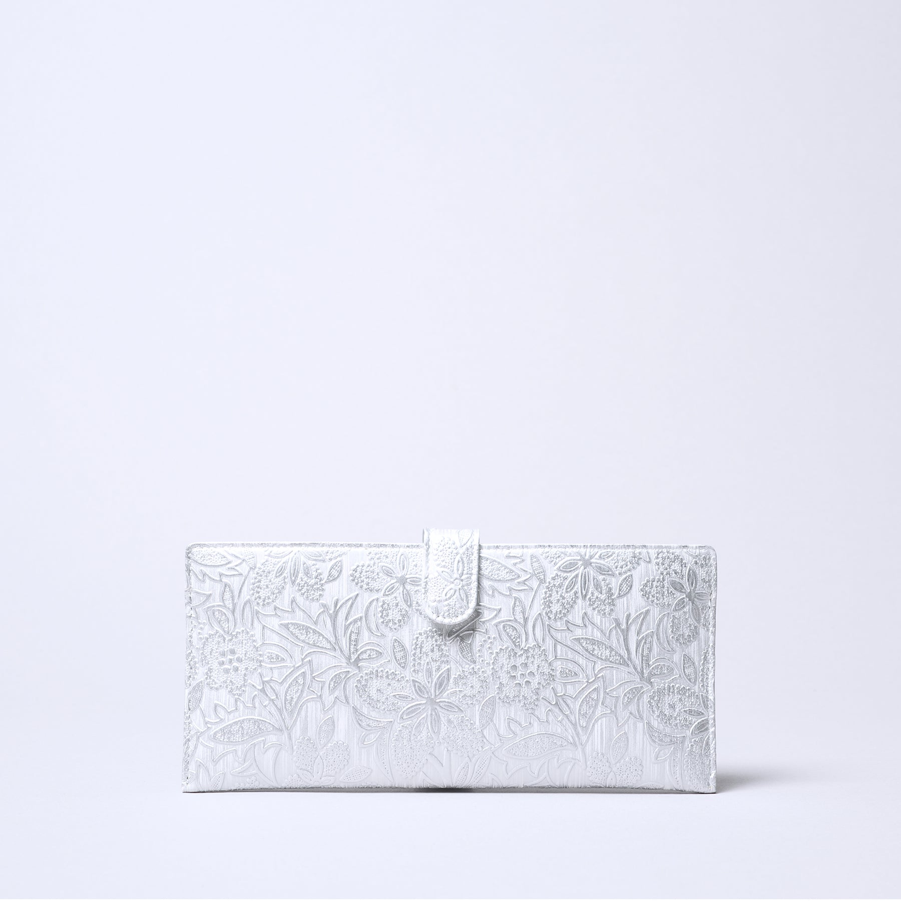 イタリア製の繊細でパール加工を施した型押し革を使用。女性らしい華やかな雰囲気の素材。日本の職人による丁寧なつくり。とても薄いスリムな作りですがお札、カード、小銭等収納可能。