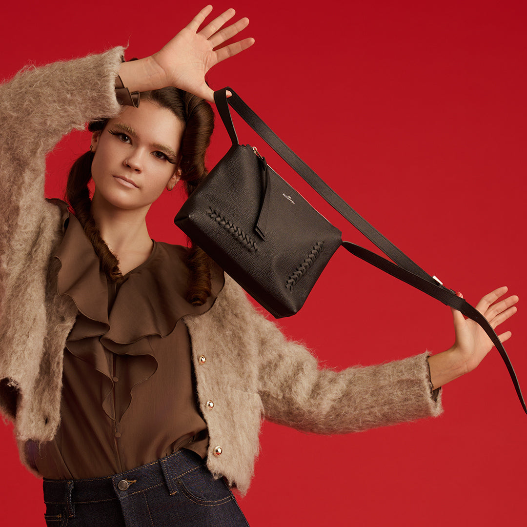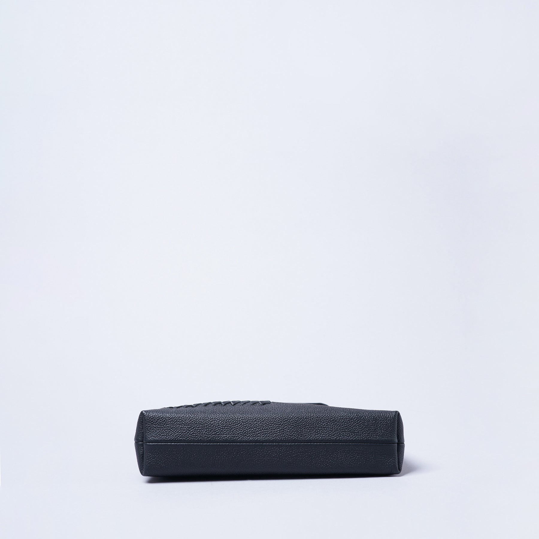 本体に施したアローステッチと、存在感のあるファスナーハンドルがクールなセカンドバックです。外見の印象とは違って身に着けるとライトでソフト。