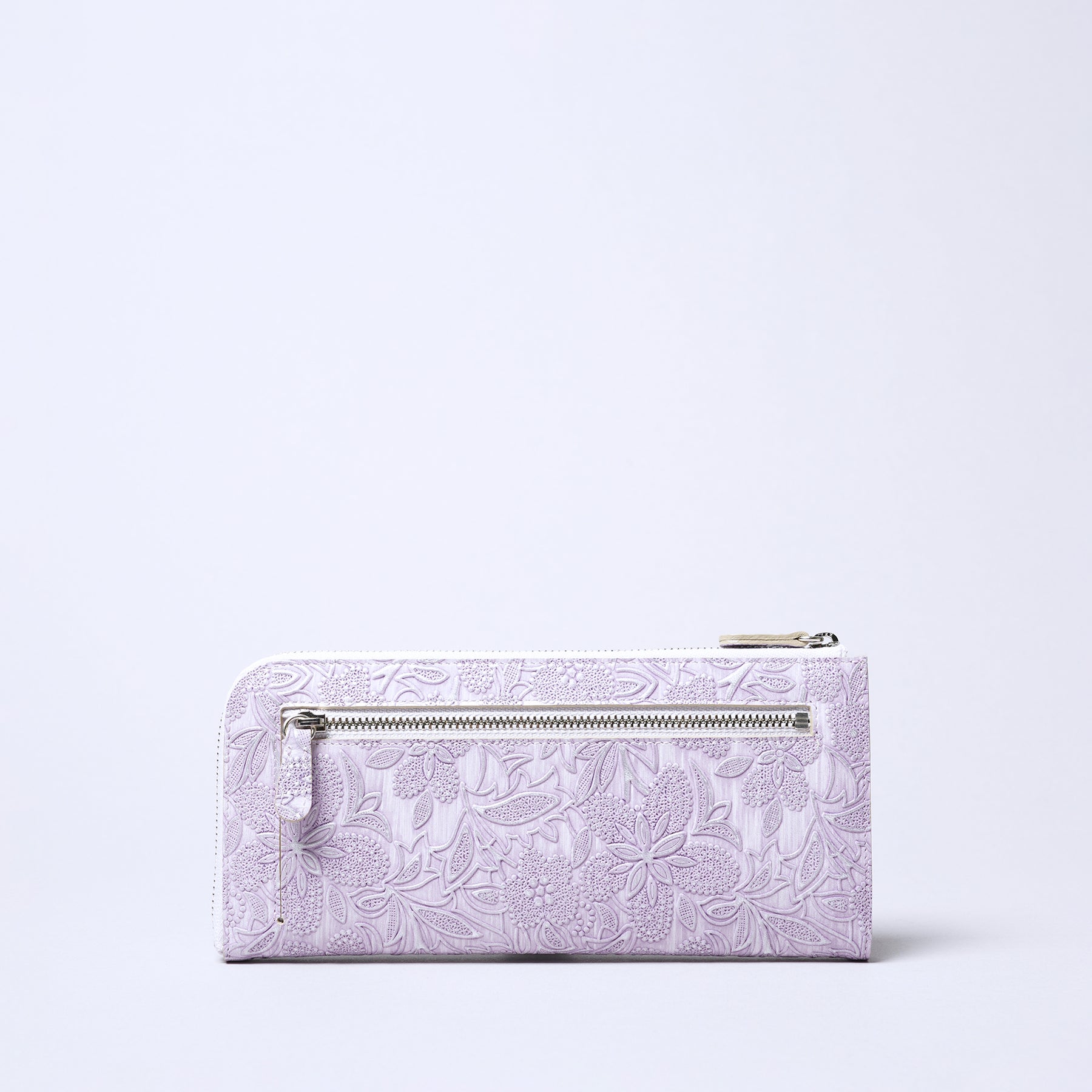 イタリア製の繊細でパール加工を施した型押し革を使用。女性らしい華やかな雰囲気の素材。日本の職人による丁寧なつくり。L字ファスナー開閉で中身が見やすく取り出しやすい作り。