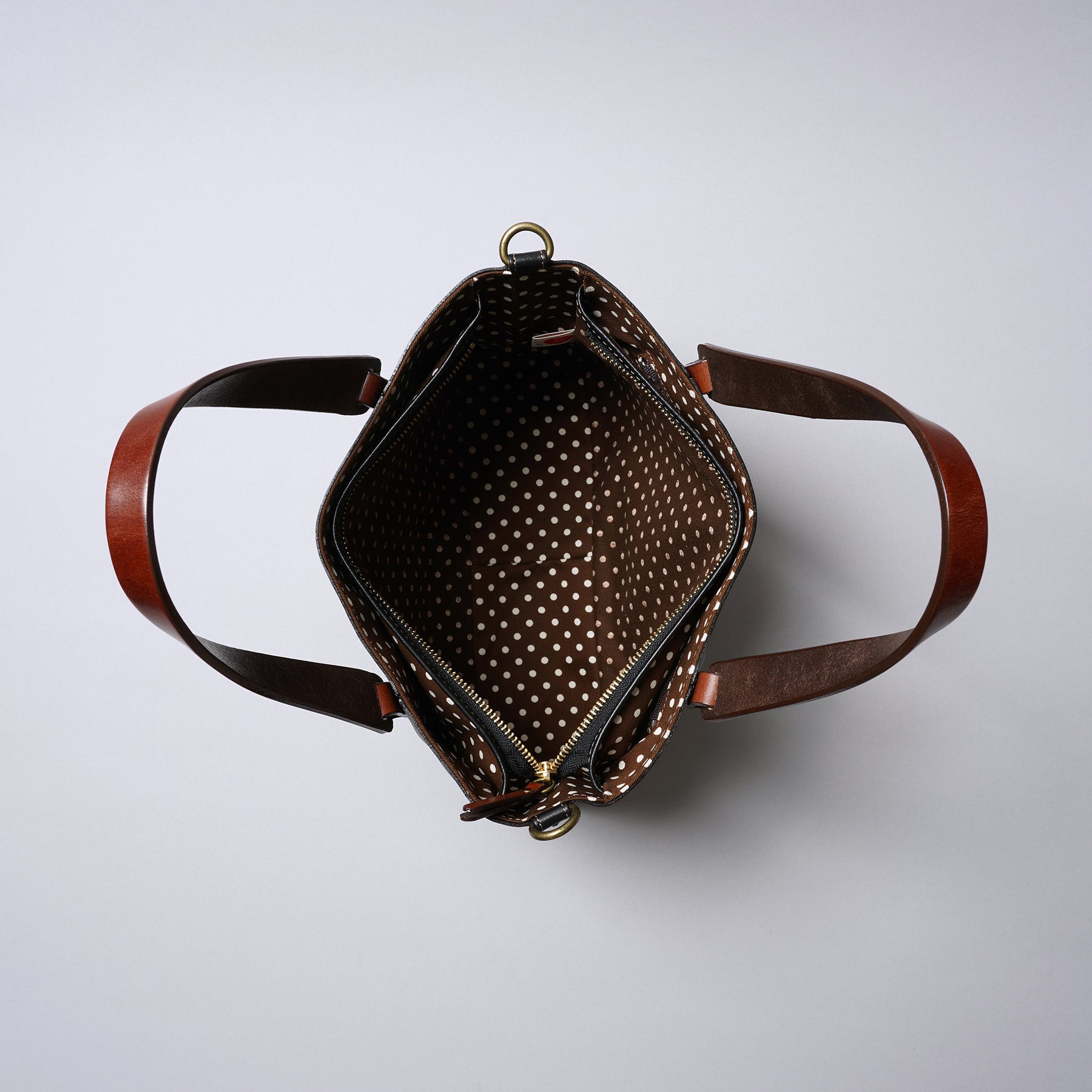 小シボの立った表情のある牛革に、ヌメ革のパーツを使用したロングセラーシリーズです。天口から覗く裏地のドット柄も特徴的です。同素材の革を使用したショルダーベルトは着脱可能。経年変化が楽しめる素材なので、使い込むほどによりソフトな良い表情に変化します。