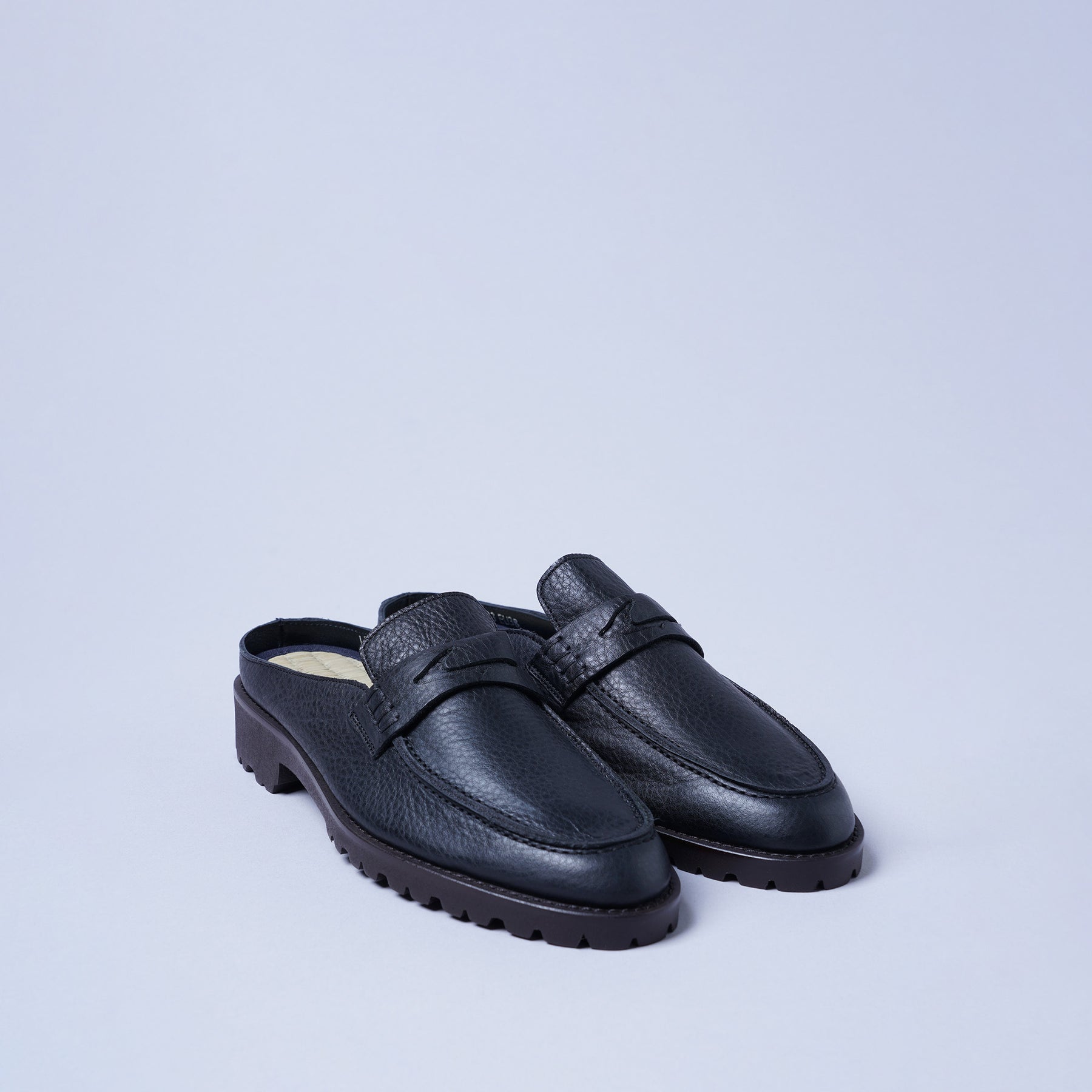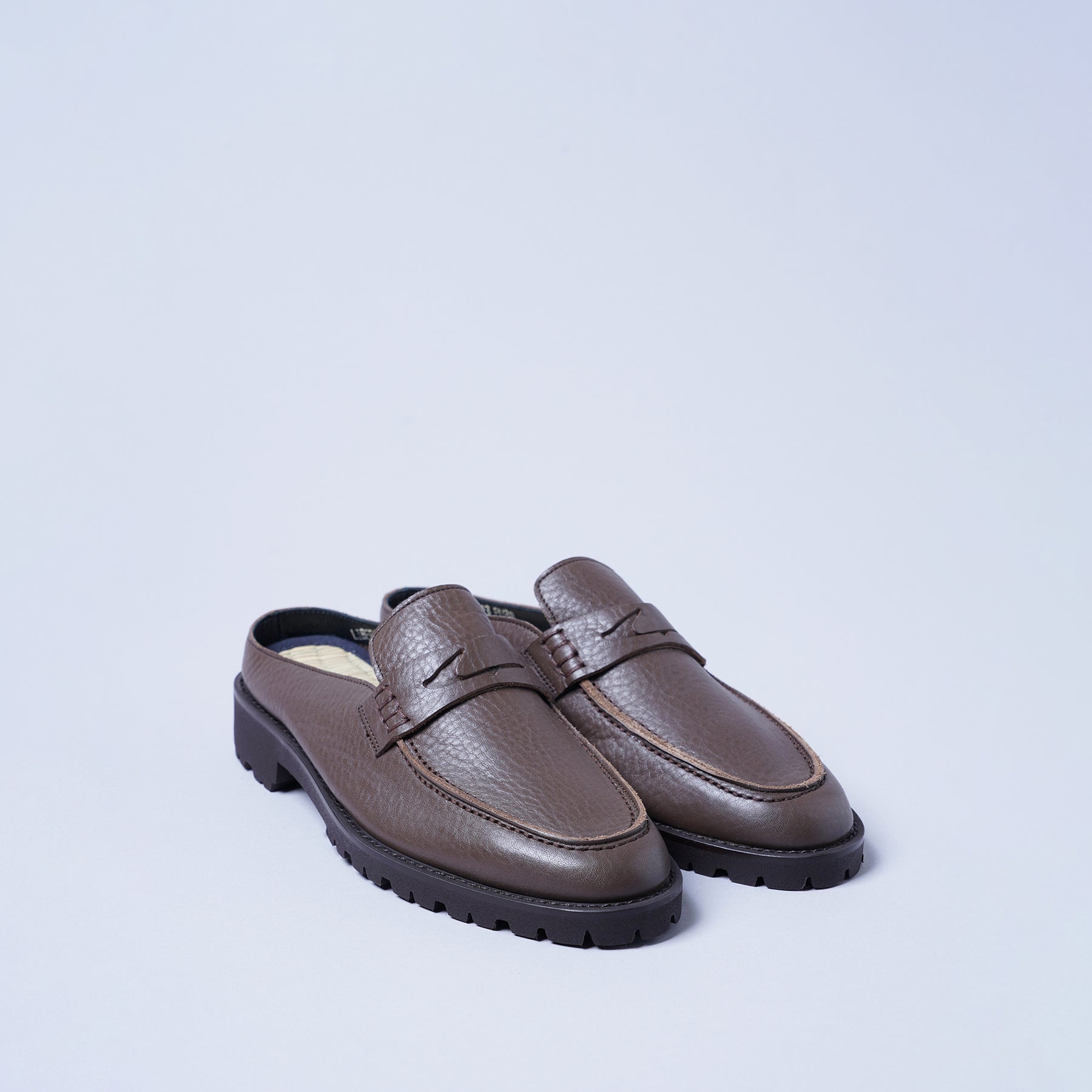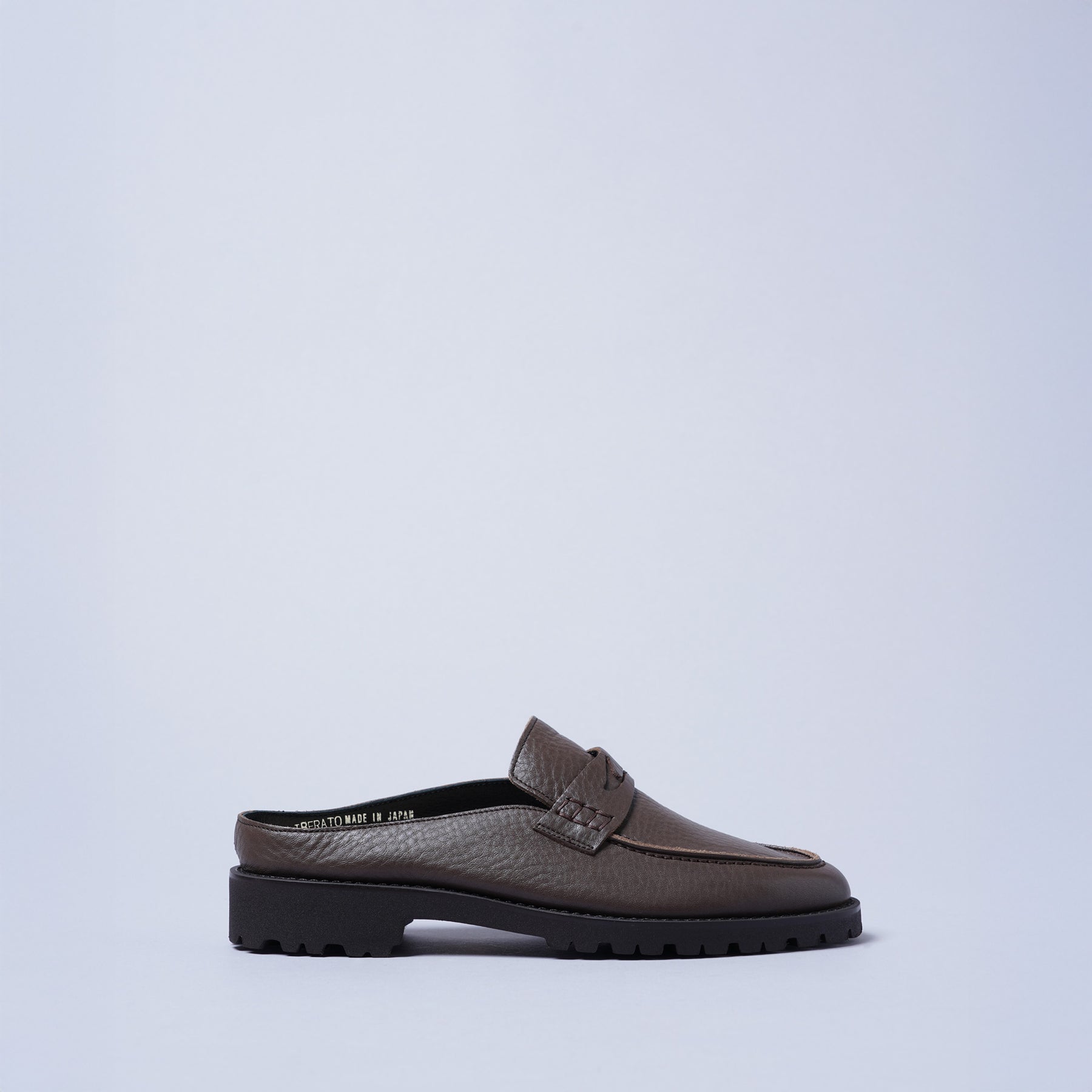 The upper is made of supple and shiny Himeji steer leather. Certified eco-friendly leather tanned with vegetable tannin, which reduces the generation of toxic substances while providing a natural texture and softness. The unlined design allows the natural suppleness of the leather to blend in with your feet.
