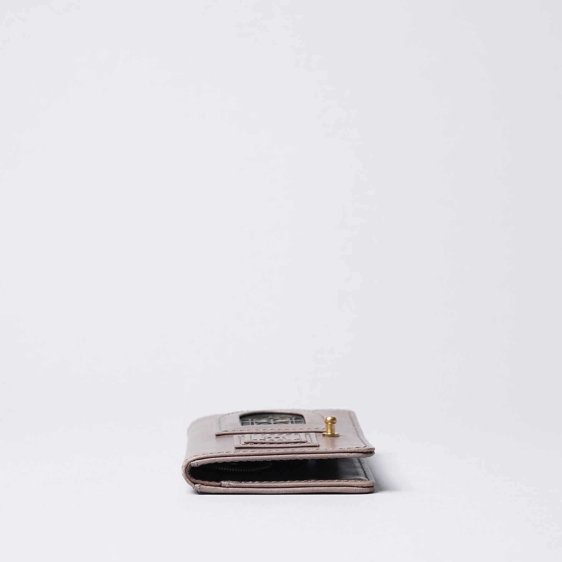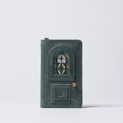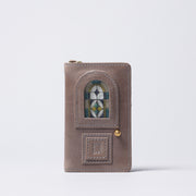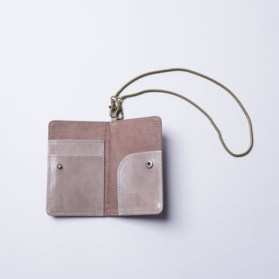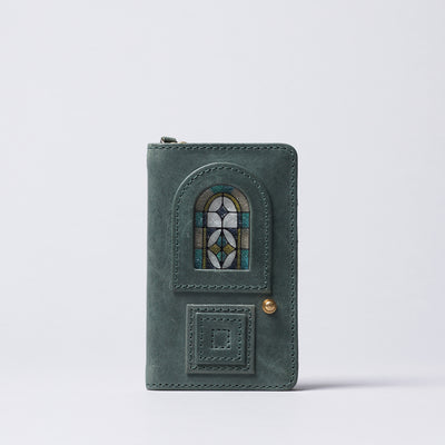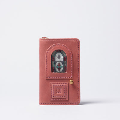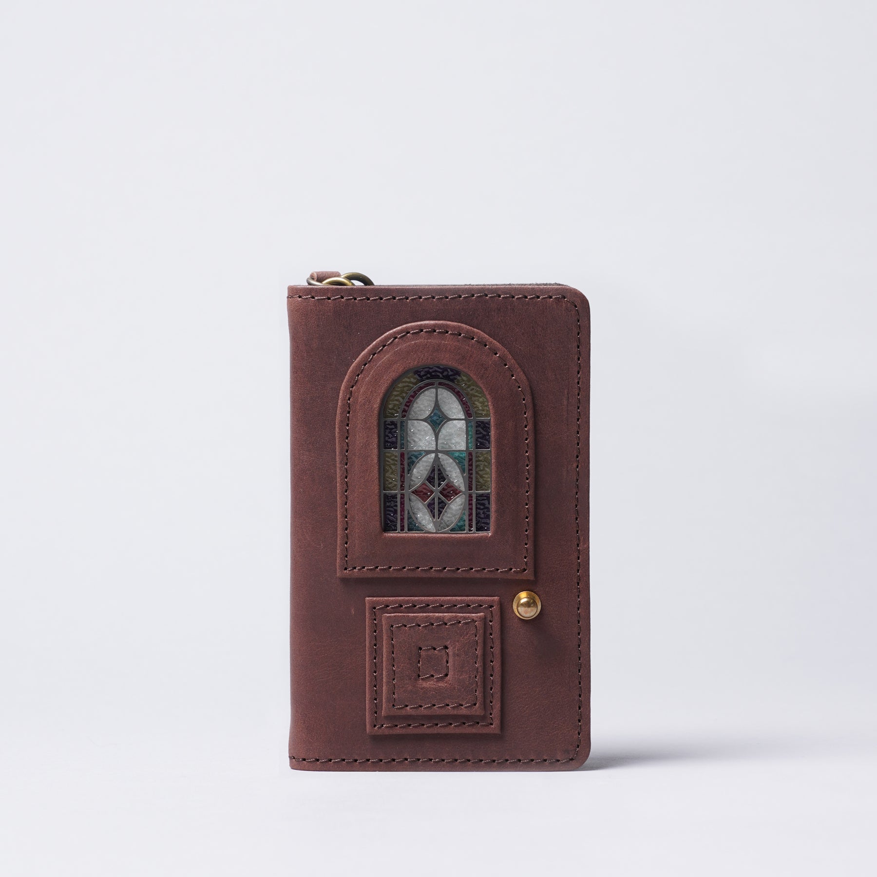 Combining genuine leather and real glass, this product is designed to look like an antique door.This is a gem of a product that only a limited number of craftsmen can produce, as the appearance can vary greatly due to minute errors when sewing. It has a slim design with a hook closure on both sides and can hold three cards inside and one card on the back.The lining has a short brushed surface to prevent cards from slipping out.The main body comes with a round chain that can be detached with a swivel hook.The material is antique gold with a luxurious feel.It is a convenient item to use on your wrist, through the handle of your bag, etc.