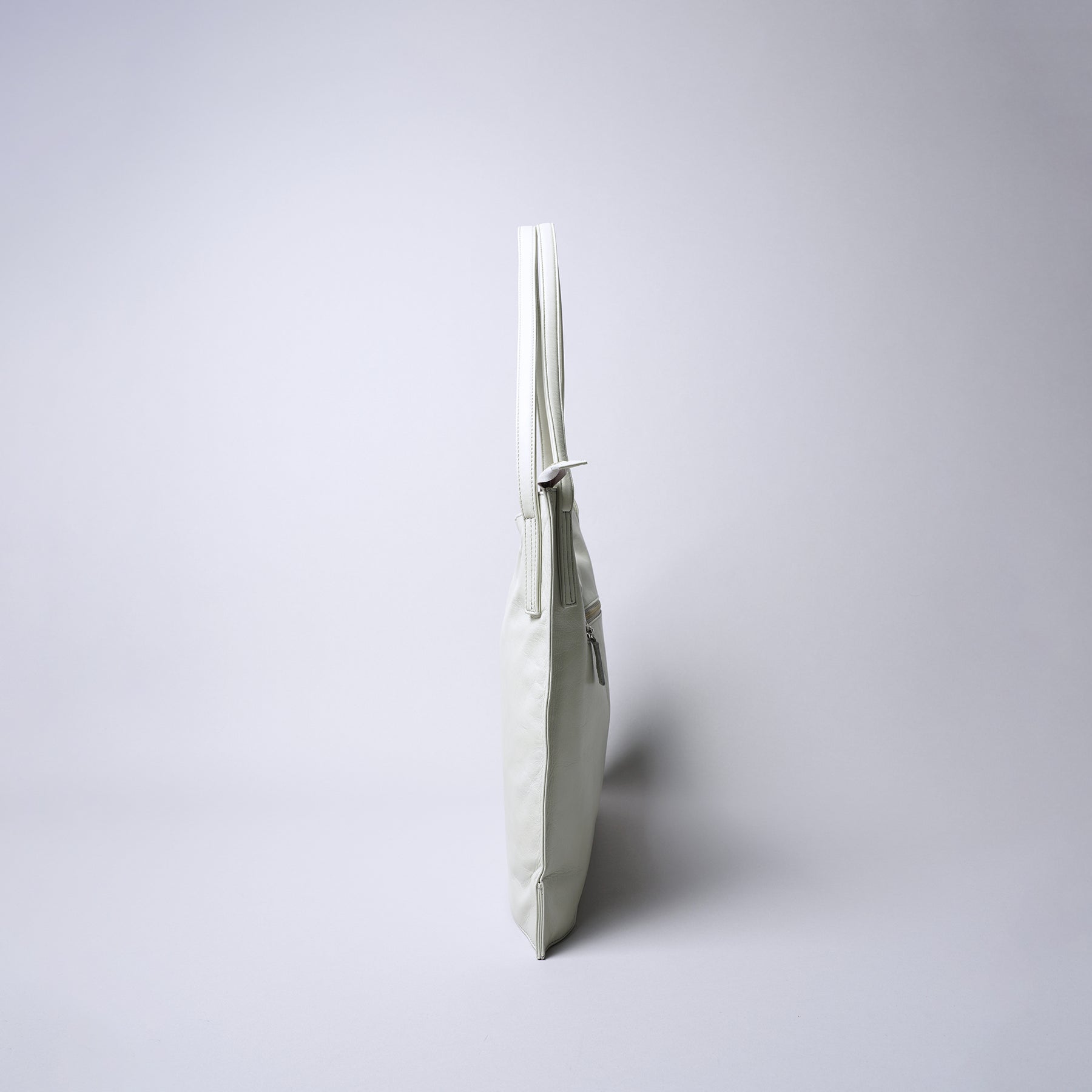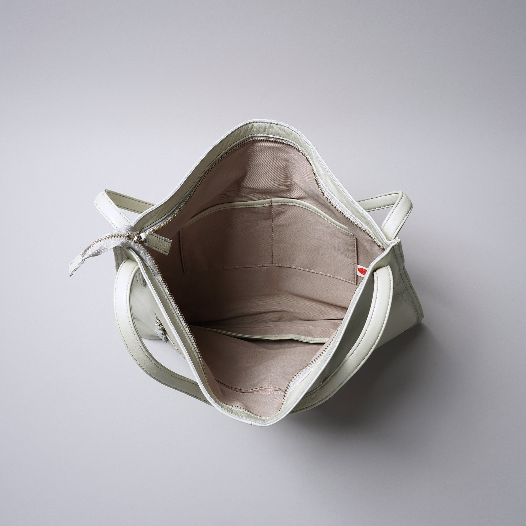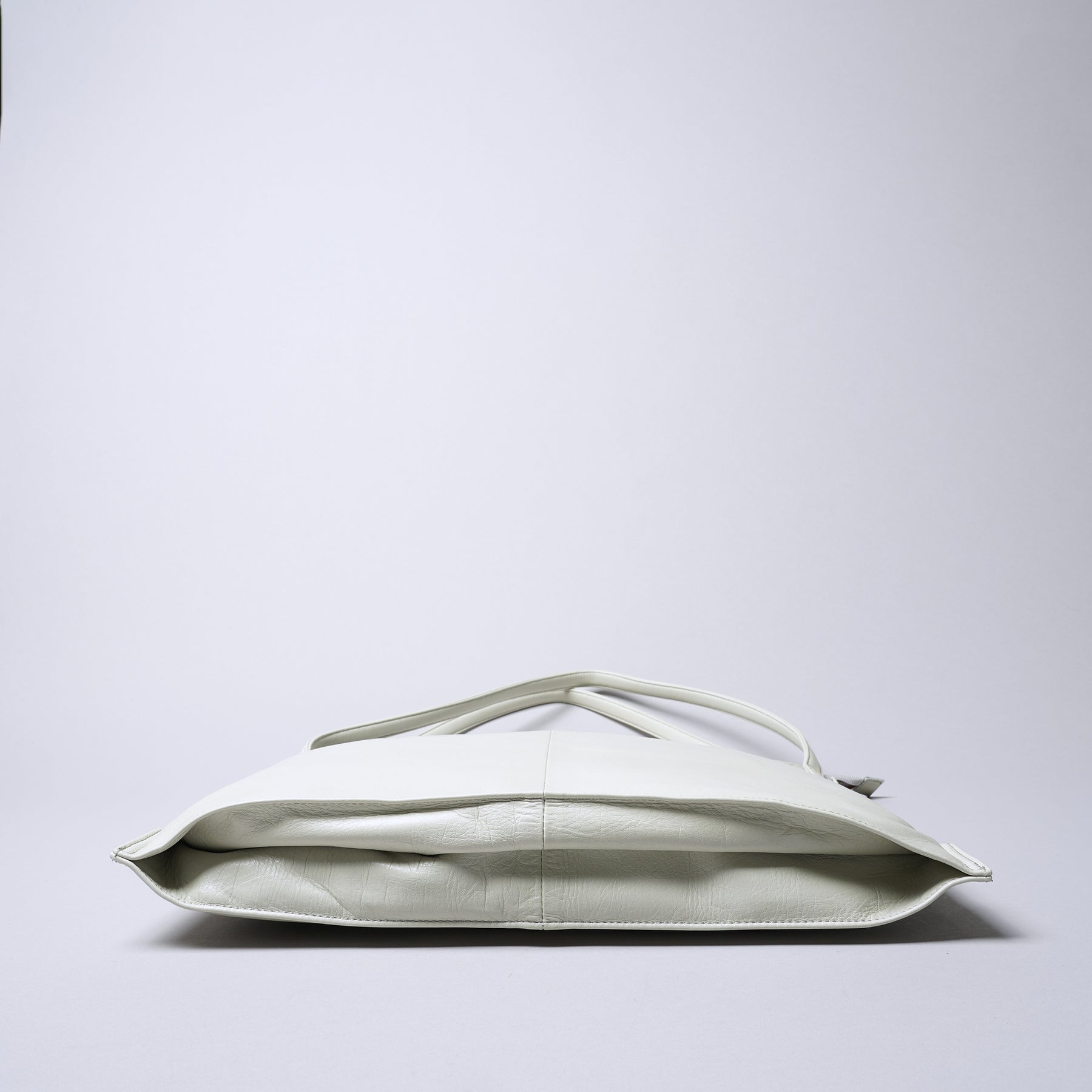 這款纖薄型A4托特包採用手感柔軟的牛皮製作而成,以俐落的直線線條為主軸設計,拿在手上散發出簡約利落感。包身放入物品後會隨著所裝物品膨起,呈現出不同的立體輪廓,是一款能夠享受包包外型變化樂趣的商品。