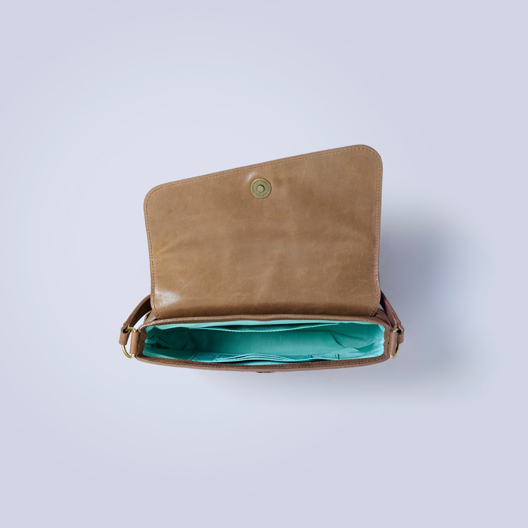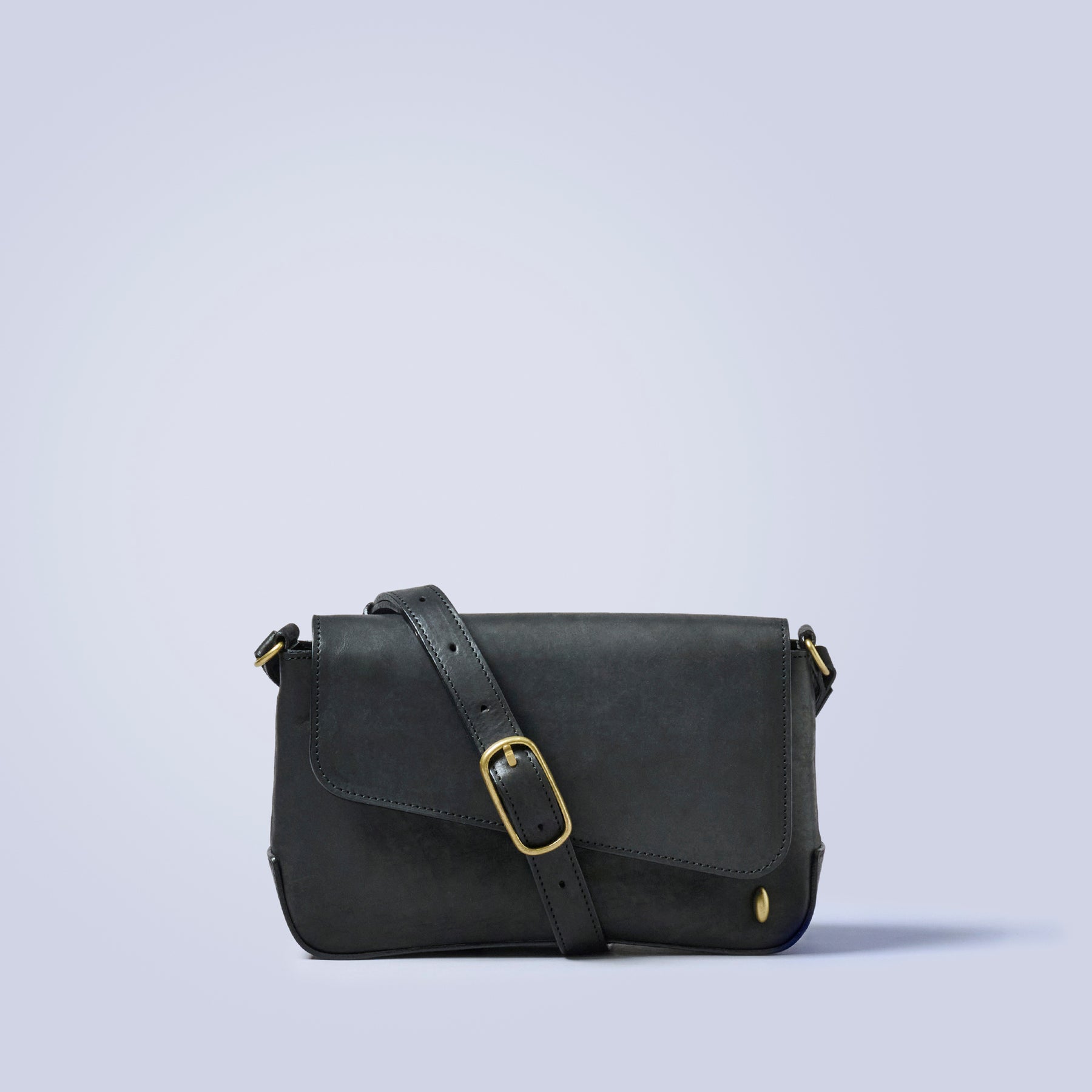 這款簡約的肩背包,於磁扣翻蓋下方加入斜切設計,造型獨特。