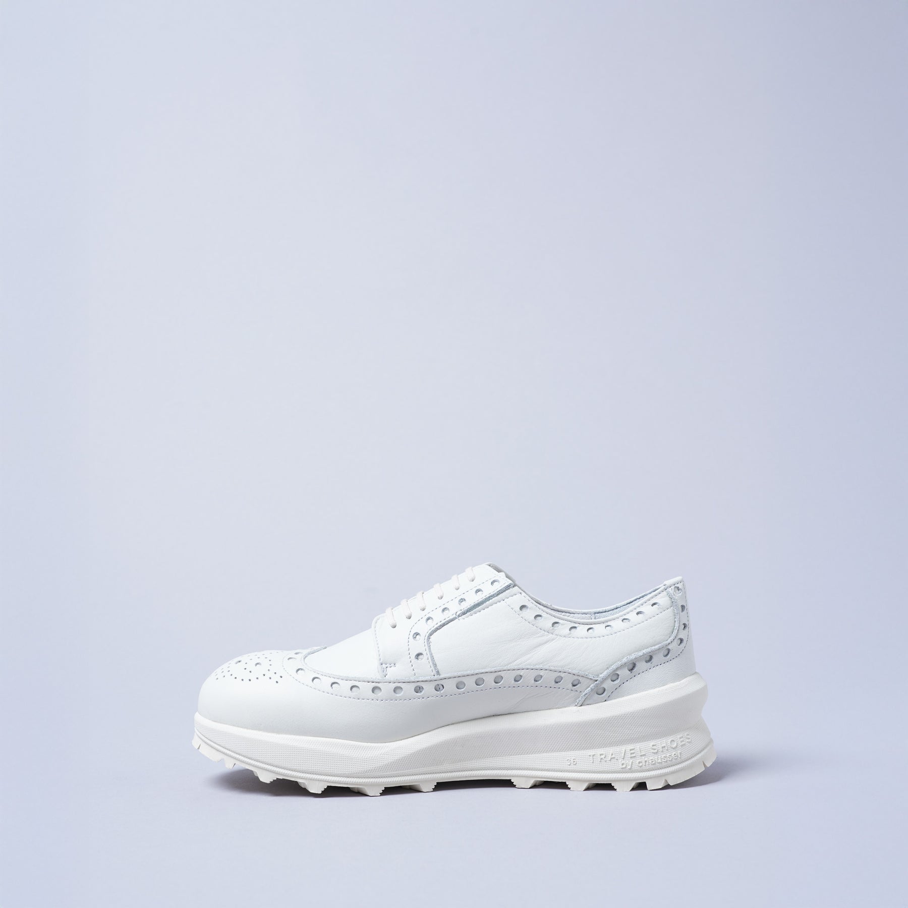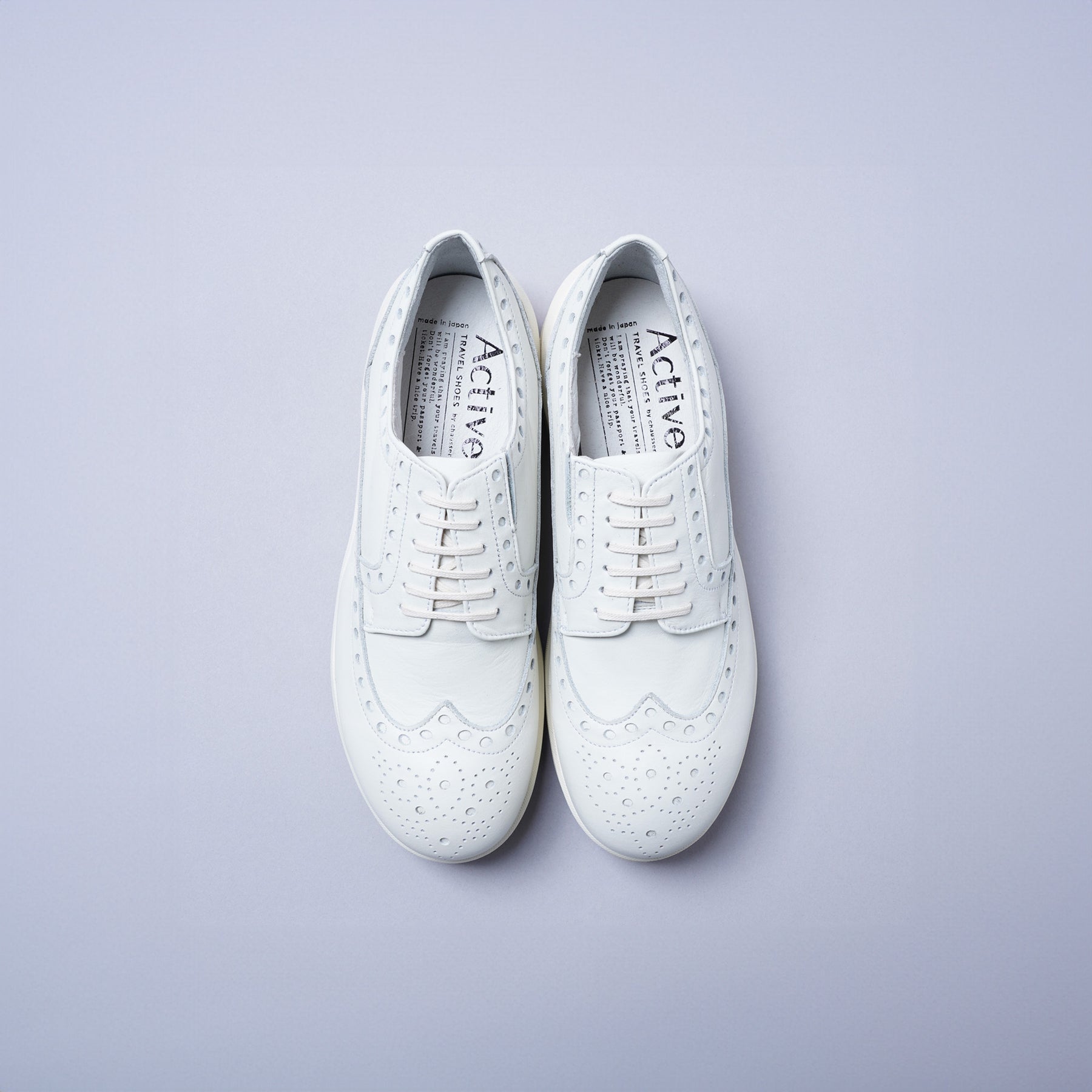 TRAVEL SHOES Active系列的這款翼紋牛津鞋,以整齊排列的圓形雕孔裝飾,展現出chausser品牌獨有的中性風格。Active系列全款式皆在鞋口加入柔軟墊,即使長時間行走也能保有舒適度。封閉式鞋襟的內側還設有鬆緊帶,不需解開鞋帶即可輕鬆穿脫。TRAVEL SHOES以「旅程」為主題展開商品系列,每雙鞋皆附有方便攜帶的旅行用鞋袋。鞋面皮革在染色階段即以氟素樹脂浸透至皮革纖維,並在表面施予防潑水處理,使之既能保有柔軟質地又可有效防水並維持透氣性。