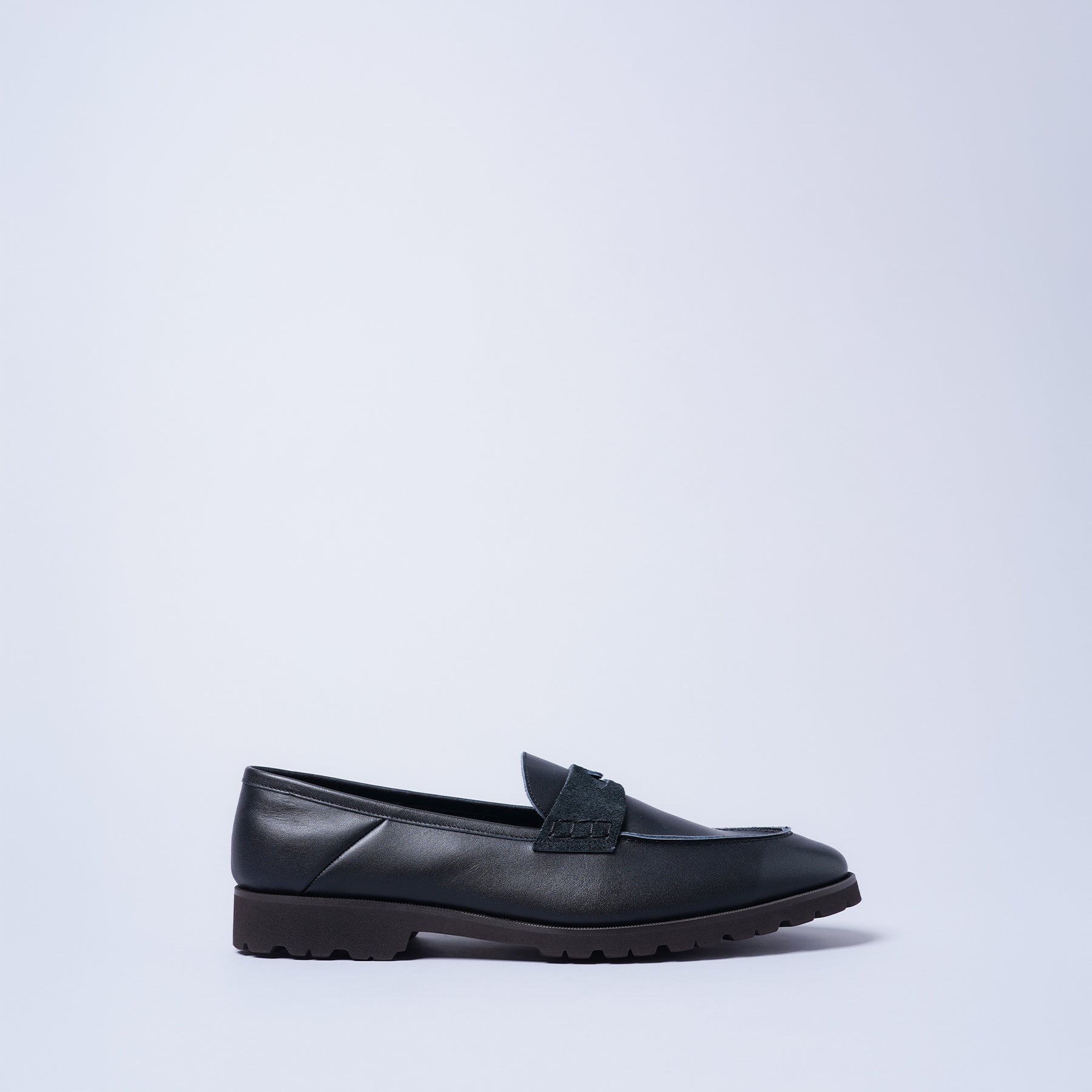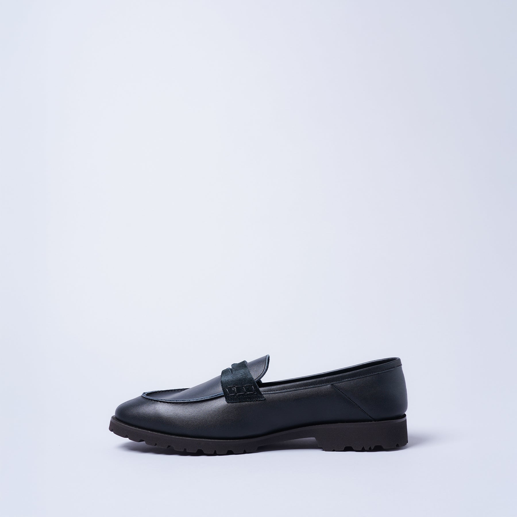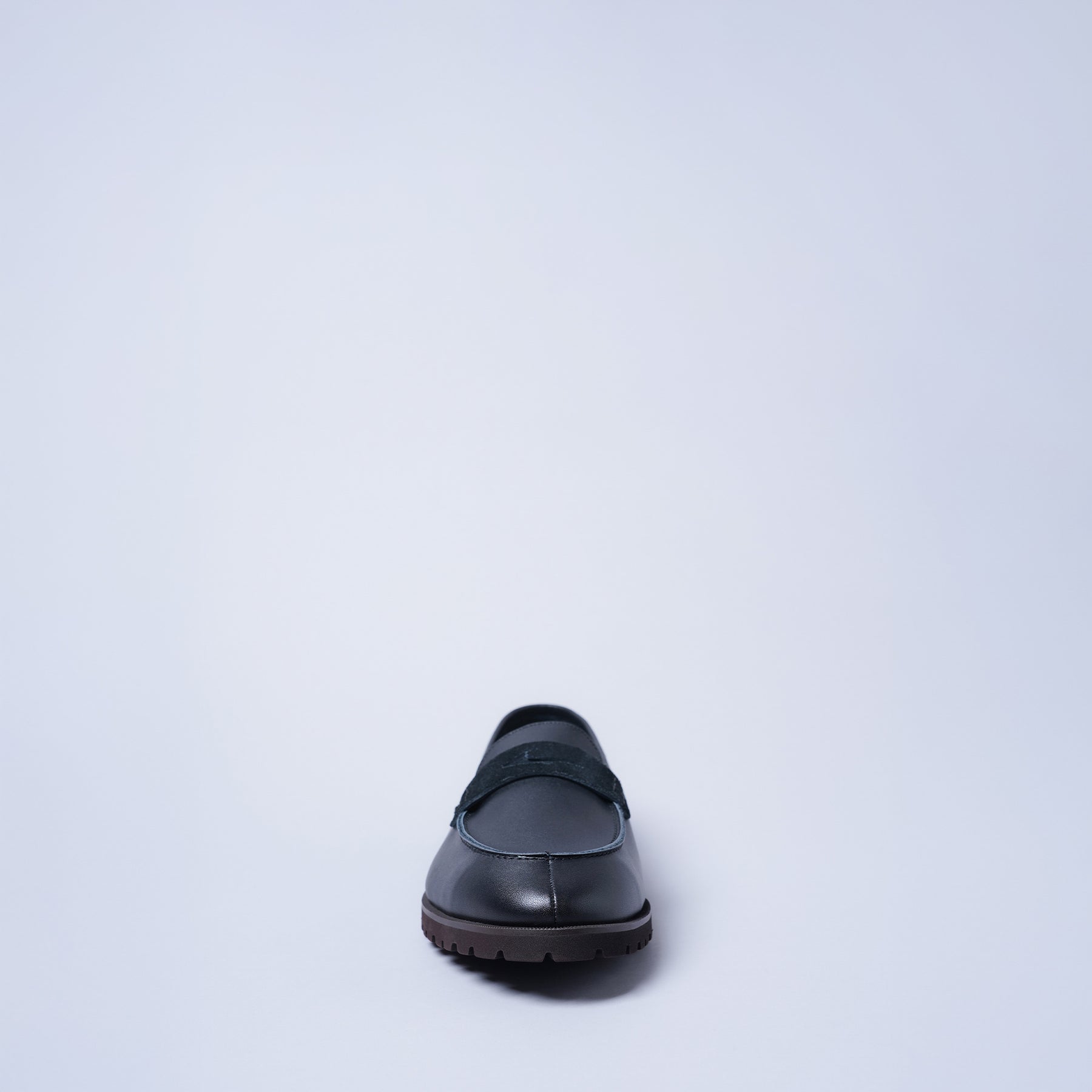 樂福鞋的鞍帶部分使用皮革內側麂皮成為設計點綴。