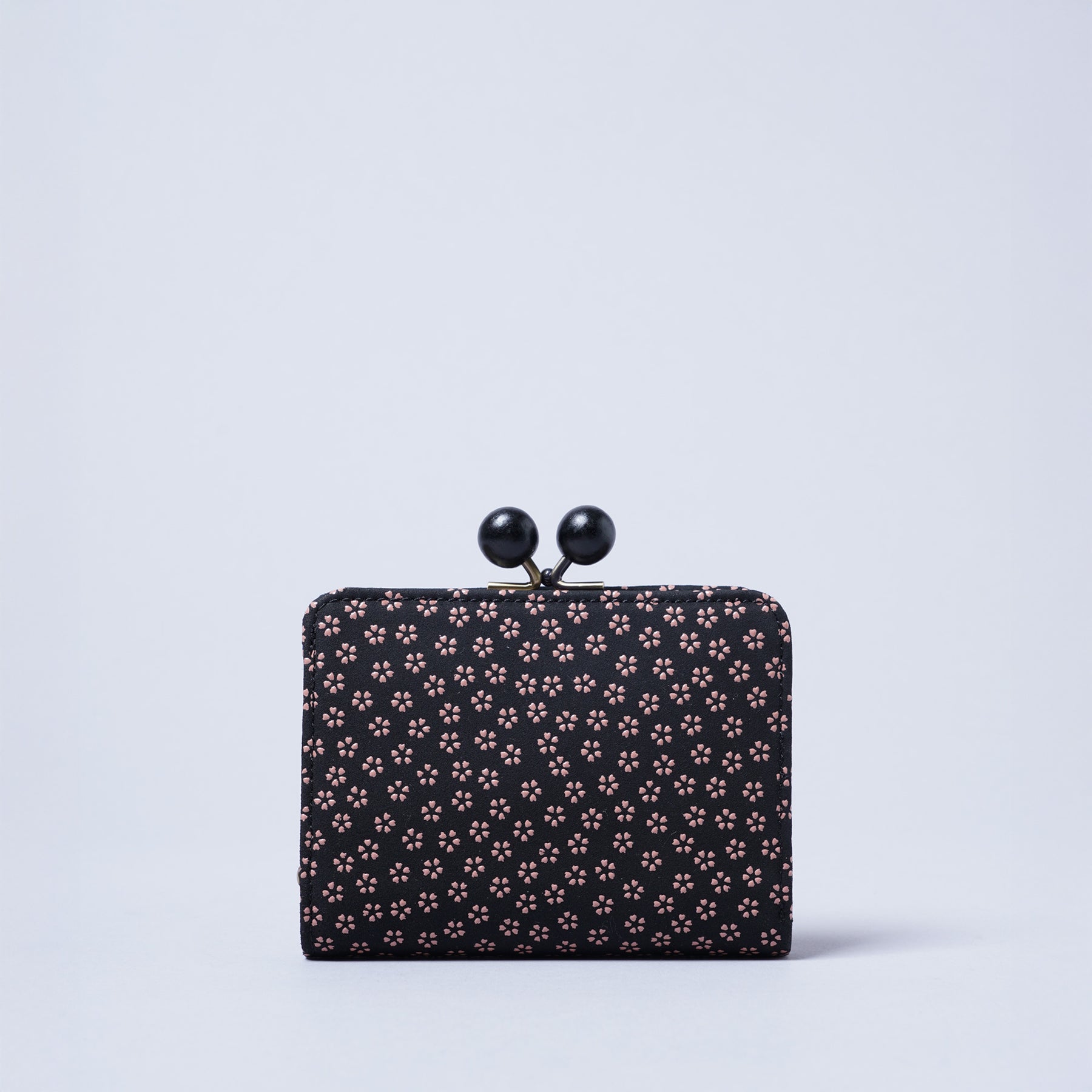 本シリーズでは木製で大きめのらっきょう玉と真鍮色の金具が上品なバランスで仕立てられたがま口を使用しています。らっきょう玉は大きいながらも軽いものを使用しているので全体の重みには影響しないのが嬉しいポイント。深い色味と木目仕様が和風をさらに演出したアクセントになっています。