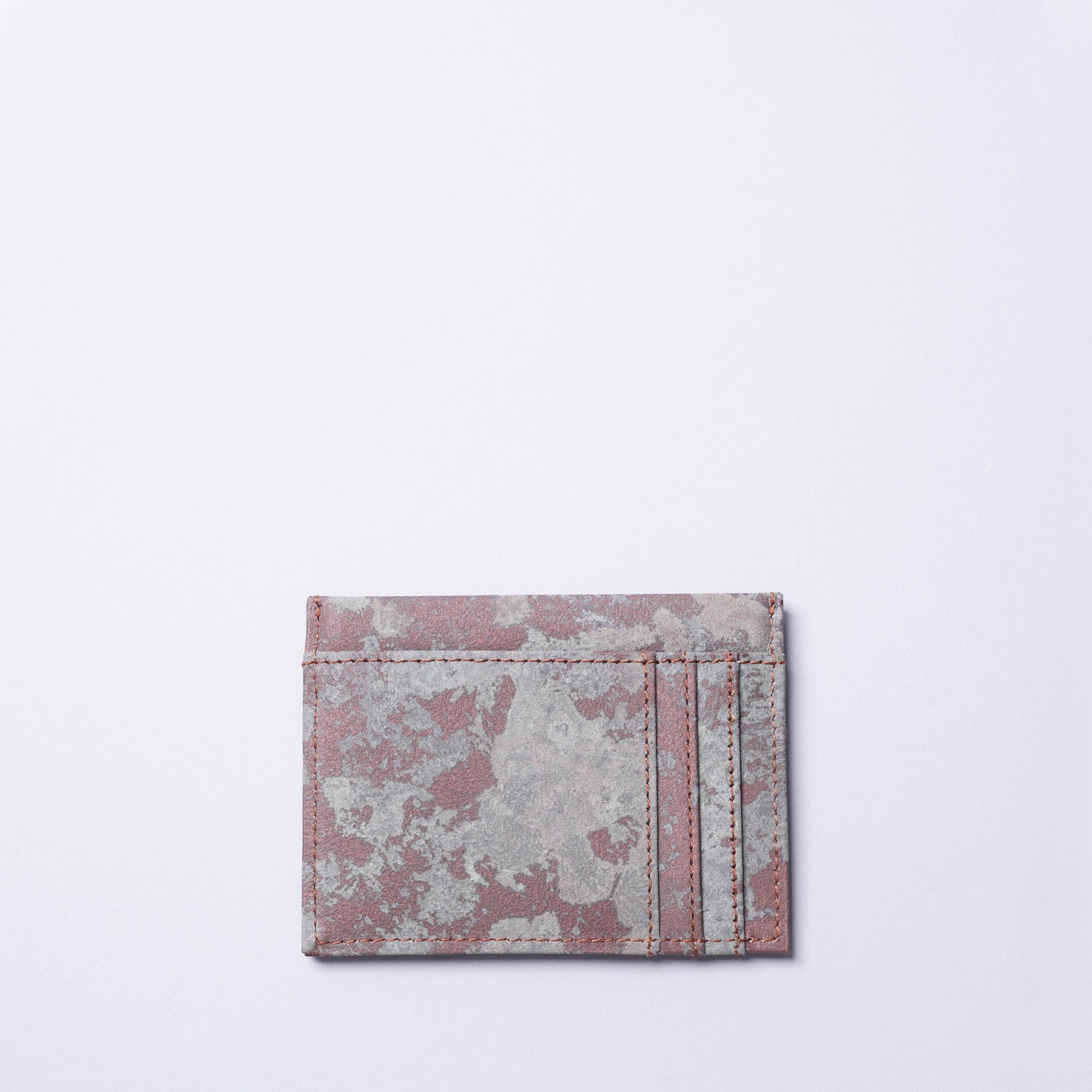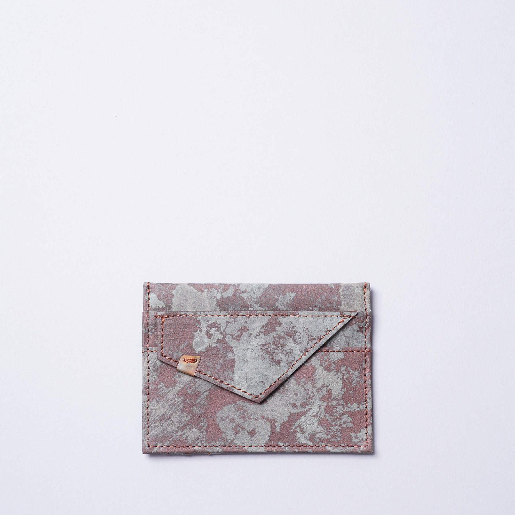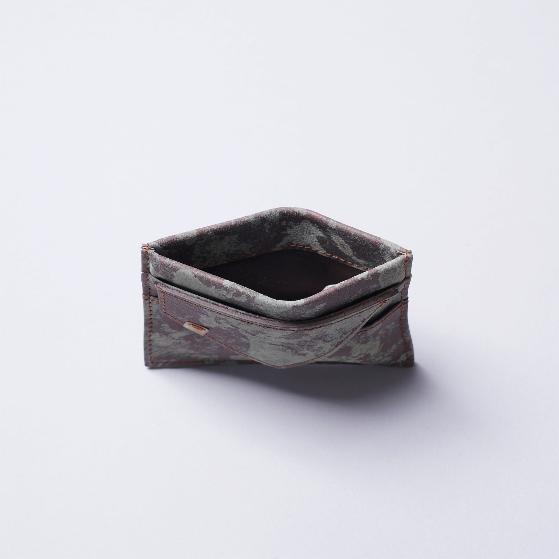 這款小物收納夾是採用黃銅鏽加工處理之皮革製成。此種材質乃由皮革職人依據積累經驗及感性將一片片皮革噴塗黃銅或紅銅,使之產生鏽化效果,既而精心製作成具有工藝品等級的皮革。這款商品符合現今計無現金時代的外出需求,外觀小巧,內部卻可收納卡片、零錢、鑰匙等隨身物品。翻蓋上手縫的小巧金屬飾板,成為點綴keu品牌的專屬標記。