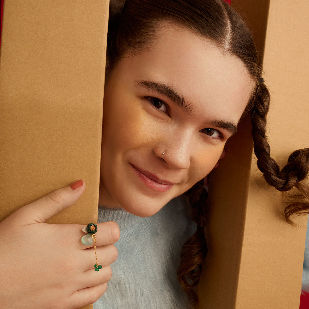 此款Free Size的鏈戒可配戴在任一手指,透過滑動鏈子上的小球設計即可輕鬆配戴及取下。鏈戒上鑲著不同大小的豚皮編織花朵與天然石,佩戴時金色細鏈自指間垂下搖曳,展現優雅姿態。也可將此款商品與其他耳環組合佩戴,或是做為項鍊上的吊墜使用,可盡情享受各種不同配戴樂趣。